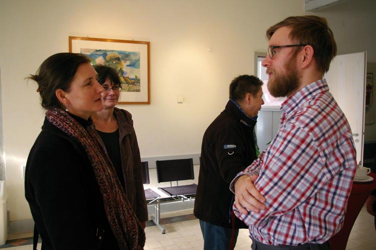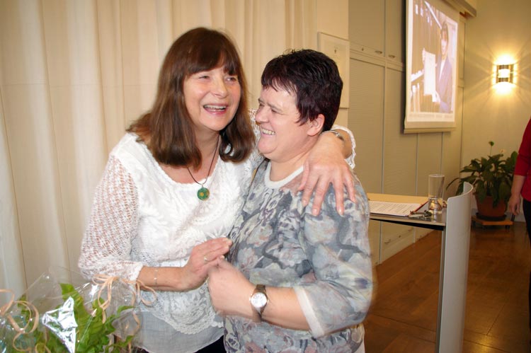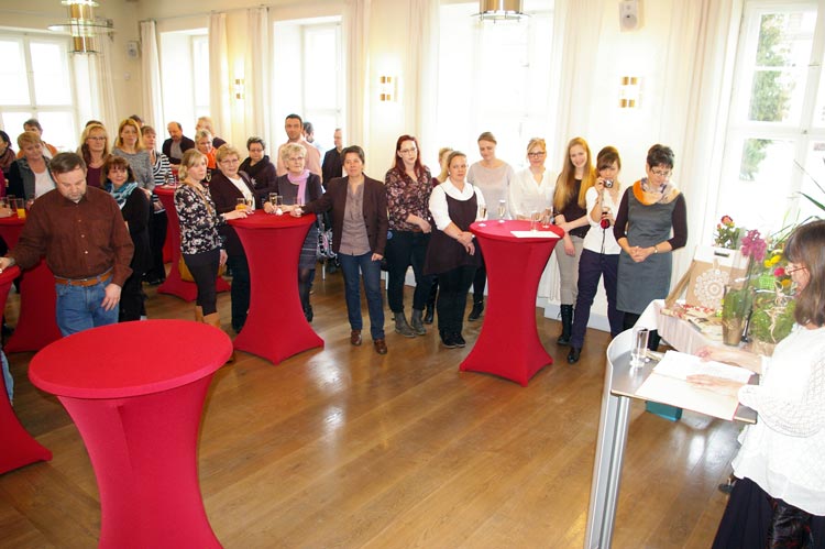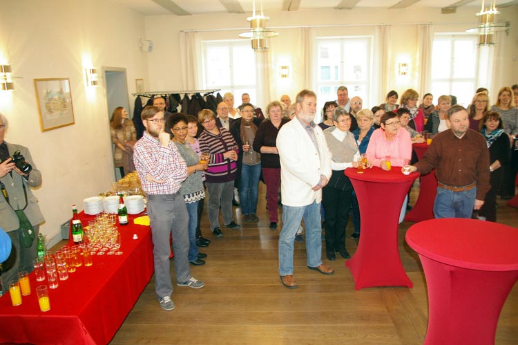 Birgit Ritter hielt im Namen der Kollegen eine herzliche Rede, die genauso wie die vielen Umarmungen an diesem Tage belegen – mit Margret Sperling verläßt eine geschätzte und beliebte Mitarbeiterin die Stadtverwaltung. Sie überreichte der Jung-Ruheständlerin ein Album mit vielen Erinnerungen, die die Kollegen zusammengetragen haben. Ehemann Gundolf Sperling, der natürlich auch dabei war, ließ zahlreiche Fotos und Zeitungsausschnitte über die Arbeit seiner Frau als Stadtarchivarin aus 25 Jahren per Beamer an der Wand ablaufen. Immer wieder fiel der Blick bei den zahlreichen Gesprächen nach der Freigabe des Büfetts auf diese Bilder. Margret Sperling hat vom Berufsleben Abschied genommen – doch hören und lesen werden wir auch weiterhin von ihr. Michael-Peter Jachmann