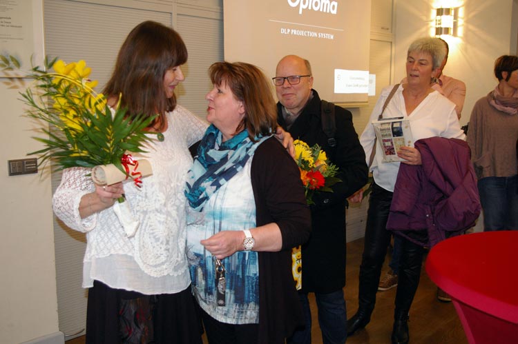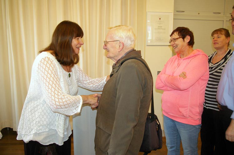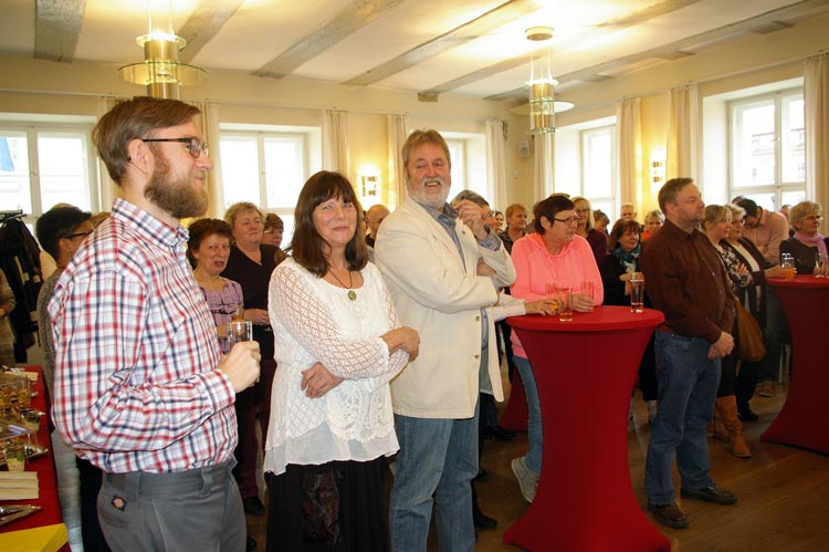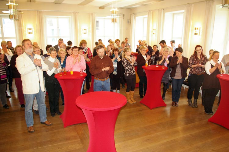 Birgit Ritter hielt im Namen der Kollegen eine herzliche Rede, die genauso wie die vielen Umarmungen an diesem Tage belegen – mit Margret Sperling verläßt eine geschätzte und beliebte Mitarbeiterin die Stadtverwaltung. Sie überreichte der Jung-Ruheständlerin ein Album mit vielen Erinnerungen, die die Kollegen zusammengetragen haben. Ehemann Gundolf Sperling, der natürlich auch dabei war, ließ zahlreiche Fotos und Zeitungsausschnitte über die Arbeit seiner Frau als Stadtarchivarin aus 25 Jahren per Beamer an der Wand ablaufen. Immer wieder fiel der Blick bei den zahlreichen Gesprächen nach der Freigabe des Büfetts auf diese Bilder. Margret Sperling hat vom Berufsleben Abschied genommen – doch hören und lesen werden wir auch weiterhin von ihr. Michael-Peter Jachmann
