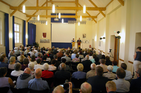 Der Festakt zum 100-jährigen Schuljubiläum fand gleich nebenan in der früheren Sporthalle statt, viele Jahre schon die Aula des Gymnasiums. Wilfried Kühn, der die Vorbereitungsgruppe der Jubiläumstage leitete, hatte mit seinen Mitstreitern ein gelungenes Programm zusammengestellt und begrüßte die geladenen Gäste, darunter viele ehemalige Lehrer und Schüler. Ältester im Saal war Alois Zieber, einst einfühlsamer Lehrer für Geschichte und Staatsbürgerkunde, aus dem fernen Thüringen war Reiner Bachert angereist, Siegfried und Edelgard Dolch, Margot Berlin, Renate Heinrich, Barbara und Günther Heiland waren ebenso dabei wie Klaus Vörtmann, Wolfgang Breßler, Petra Grahlow, Klaus-Manfred Jahn... Auch die frühere Schulleiterin Katrin Schulz, 1976 selbst Absolventin, hatte in der ersten Reihe Platz genommen.