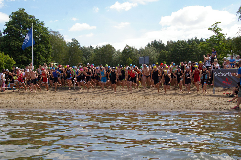 Fast 250 gemeldete Teilnehmer, 207 gestartete Sportler und 192, die ins Ziel kamen – das ist die zahlenmäßige Bilanz des 5. Schorfheide-Triathlons mit Start und Ziel im Strandbad Wolletzsee. Vor allem aber war es wieder ein grandioses Erlebnis für die Teilnehmer, ob schon vertraut mit den Bedingungen vor Ort und dem Kurs oder Neulinge. „Es war großartig und ich bin so was von durch“, faßte Cheforganisator Frederik Bewer – an diesem Tag noch nicht ganz zwei Wochen als Bürgermeister im Amt – das Erlebnis zusammen. Auf rund 50 Helfer, viele seit Anfang an dabei und auch beim Schorfheidelauf Helfer.